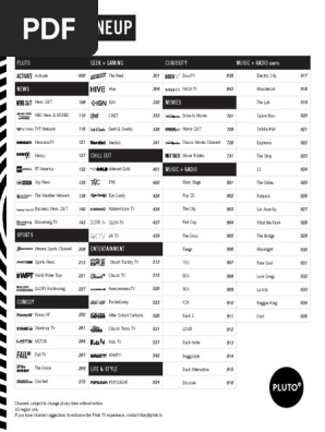 If you're curious to know this special feature, be with us and learn about personalizing your channel list. There are many different channels on pluto tv spread across categories like news, movies, latino, and sports. Combined with color coded channels, it's easy finding channels or scanning genres. Traditional television channels whose feeds are carried directly on pluto include court tv, nasa tv, discovery channel, cnn (plus sister network hln, hbo and cartoon network), weathernation tv, buzzr, newsmax tv, the trinity broadcasting network (and sister network hillsong channel), fox news (and sister network fox business), euronews, bloomberg television, sky news (plus sister network cnbc, msnbc, usa network, syfy and e! Movies pluto tv movies channel lineup. Troypoint will not be held liable for data breaches, infected/hacked devices, or isp logging caused by using unverified 3rd party applications, iptv services, addons, or. Pluto tv channel lineup 2021 new contents hide. Pluto tv has been consistently adding and rotating channels since being purchased by viacom earlier this year. There are versions of top cable networks like mtv but generally. 100s of free tv channels. Television stations can be found using your pdf viewer's find or search field. Channel lineup pluto geek + gaming curiosity music + radio cont'd 108 110 111 116 121 127 132 135 138 140 143 146 news 24/7 nbc news & msnbc cnbc tyt network newsmaxtv newsy rt america sky news the weather network business news 24/7 bloomberg tv cheddar main stage pop 20 the city red cup the cross fuego 70's 80's 90's y2k activate 000. Watch full episodes of your favorite shows from cbs, bet, comedy central, nickelodeon, mtv, vh1, and more on paramount+